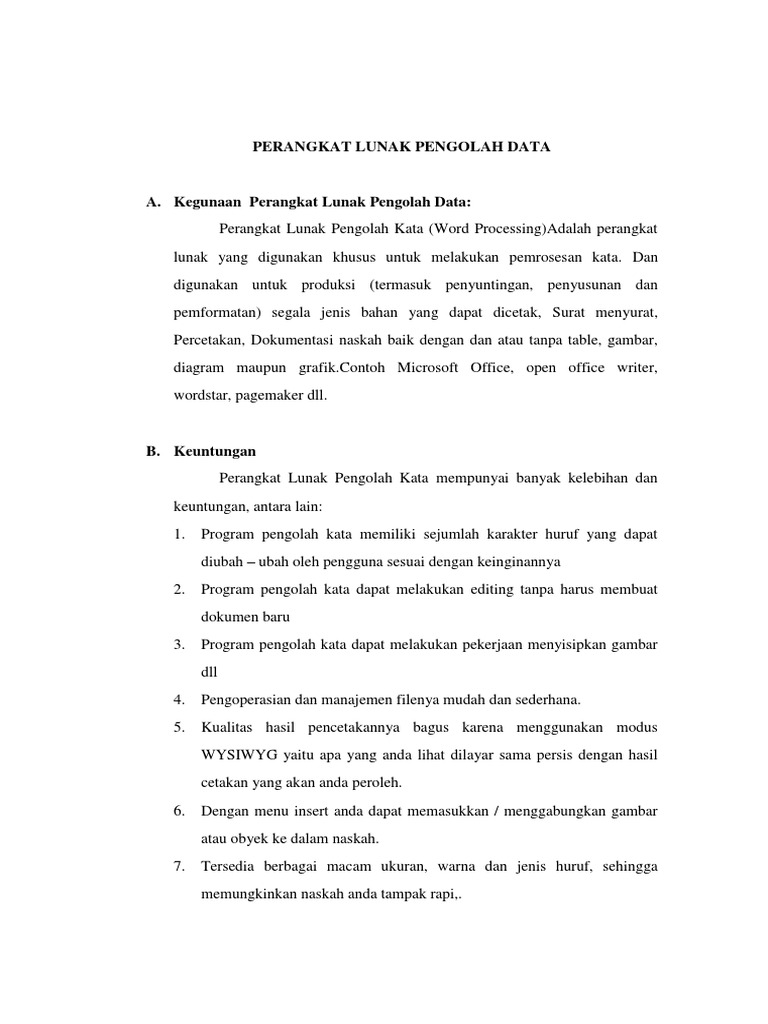 No version for linux or mac is planned. Q10 is a simple but powerful text editor designed and built with writers in mind. A word processor (wp) is a device or computer program that provides for input, editing, formatting, and output of text, often with some additional features. Unit atau peranti pemprosesan juga akan berkomunikasi dengan peranti input, output dan storage untuk melaksanakan instruksi yang saling terkait. May 26, 2021 · pengolah data intelijen merupakan bagian dari intelijen penegakan hukum, fungsi inteljien kejaksaan terbukti memastikan tidak ada tempat yang aman bagi pelaku tindak pidana dan memastikan pembangunan berjalan sesuai koridor hukum. Jul 19, 2019 · free alternative for office productivity tools: Wordperfect (wp) is a word processing application, now owned by corel, with a long history on multiple personal computer platforms. At the height of its popularity in the 1980s and early 1990s, it was the dominant player in the word processor market, displacing the prior market leader wordstar. Contohnya adalah microsoft office dan openoffice.org, yang menggabungkan suatu aplikasi pengolah kata, lembar kerja, serta beberapa aplikasi lainnya. Data yang disimpan juga dapat ditampilkan dan dicetak.
